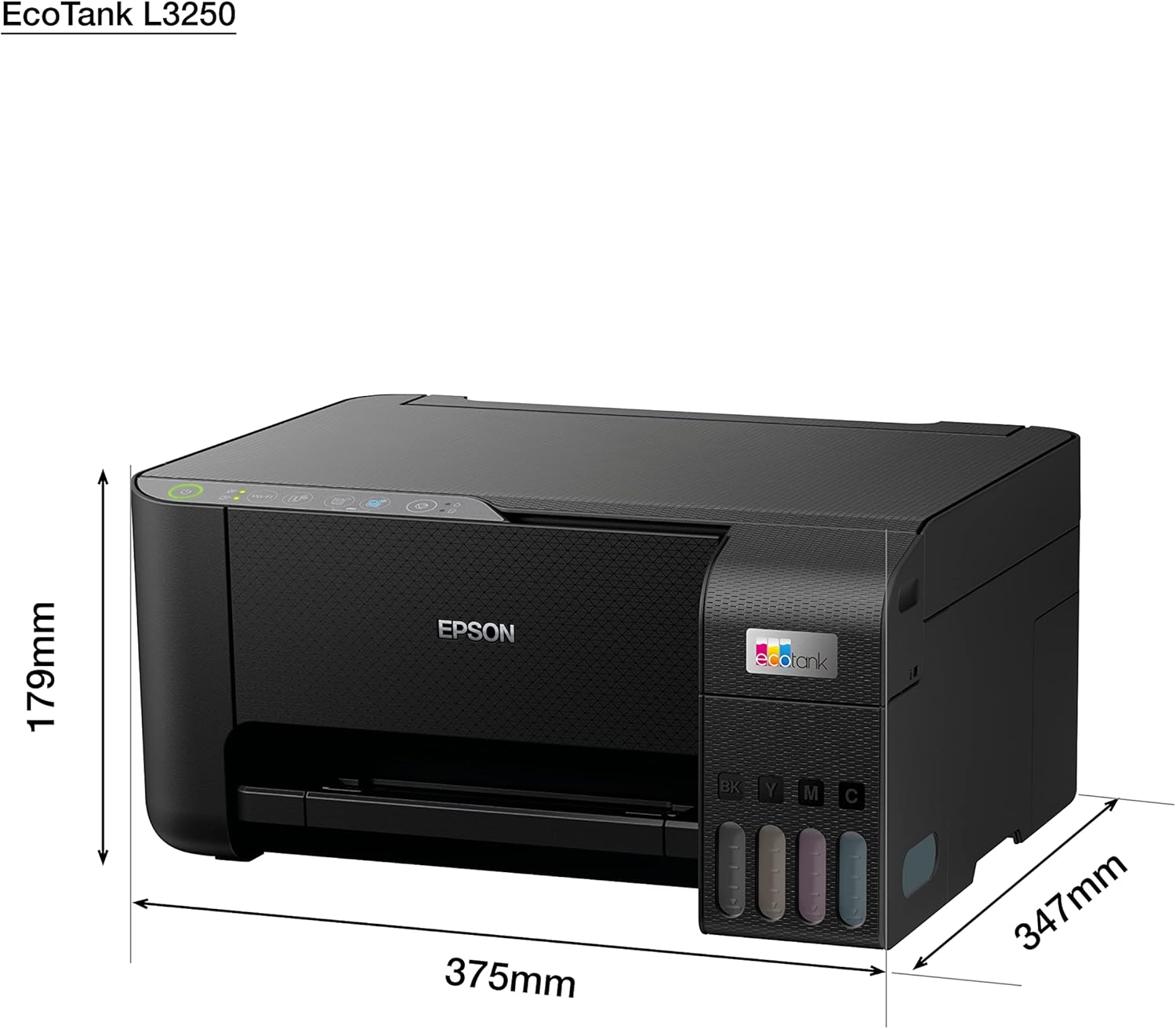 The Epson EcoTank L3250 is a wireless all‑in‑one ink tank printer designed to significantly reduce printing costs by using large refillable ink tanks instead of traditional cartridges. Its high‑capacity ink bottles can deliver thousands of prints, helping households and small offices save up to 90% on running costs compared to cartridge‑based printers.