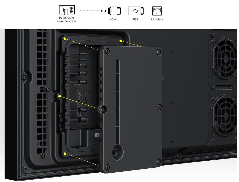 Despite its rugged capabilities, the OH24B retains a slim profile (approx. 59.8 mm depth) and relatively light weight (~8.4 kg), which simplifies installation in various outdoor locations — from building facades to freestanding structures. The smart design also includes a removable terminal cover for easy access to HDMI, USB, and LAN ports without dismantling the unit.
