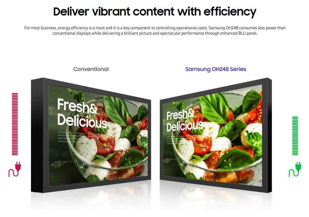 While providing high brightness and durability, the OH24B is designed with efficiency in mind. Its improved LED backlight and brightness control features reduce power consumption compared to conventional outdoor signage displays — a meaningful benefit in large deployments where energy costs can add up.