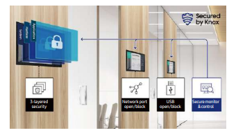 The powerful Knox security system provides rigid, three-layer security, offering airtight protection at the application, platform and system level, while restricting access to content and hardware. In addition, remote control of the network and USB ports prevents any unauthorized access.